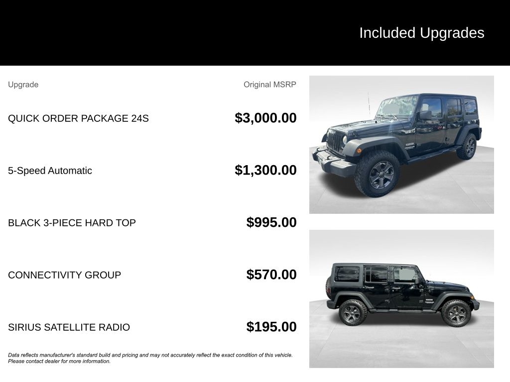Black Clearcoat 2014 Jeep Wrangler Unlimited Sport 4WD 5-Speed Automatic 3.6L V6 24V VVT**Pricing Disclosure Advertised prices apply only to the specific vehicle listed and are subject to prior sale. Prices exclude sales tax, title, license, registration, and a dealer documentary service fee of $899. No manufacturer rebates or incentives apply, as all vehicles are pre-owned. **Vehicle Availability & Accuracy All vehicles are subject to availability. Advertisements may contain pricing, photographic, or typographical errors. Dealer is not responsible for such errors. Please verify all information directly with the dealer prior to purchase. **Used Vehicle Disclosure All vehicles are pre-owned and may show prior use, reconditioning, or normal wear consistent with age and mileage. Mileage shown may be approximate. Vehicle history reports are available upon request. **Financing Disclosure (Only If Financing Is Advertised) Any advertised payment, APR, or financing term is for illustrative purposes only and not guaranteed. Financing is subject to lender approval, creditworthiness, term length, and vehicle eligibility. Not all customers will qualify for advertised terms. **Conditional Pricing Disclosure (Only If Applicable) Advertised pricing may require dealer-arranged financing and/or a trade-in vehicle. Trade-in value is subject to appraisal. See dealer for complete details. **Fee Disclosure (NJ-Specific) The dealer documentary service fee of $899 is not a government fee. Government fees are assessed separately.
