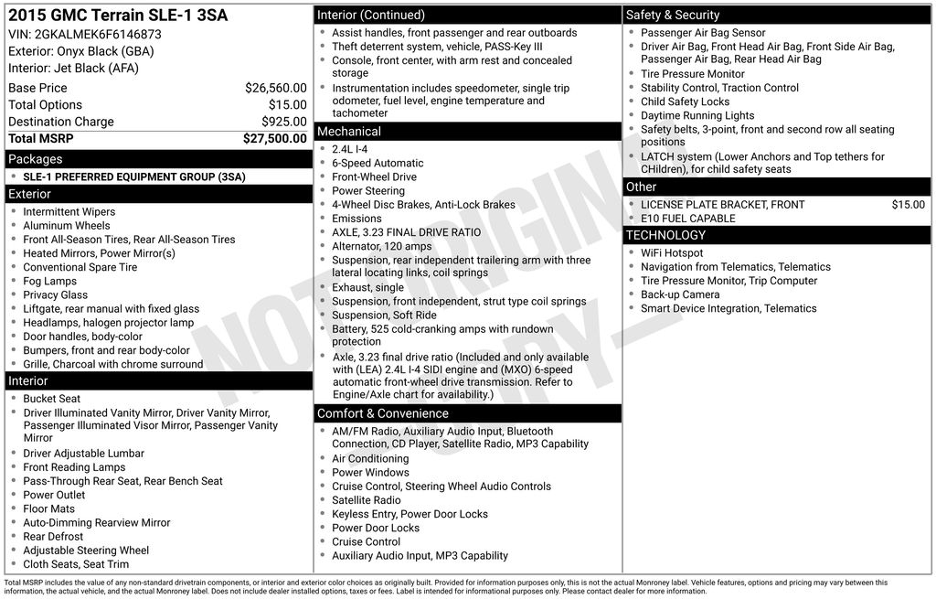Onyx Black 2015 GMC Terrain SLE-1 FWD 6-Speed Automatic 2.4L 4-Cylinder SIDI DOHC VVT22/32 City/Highway MPG