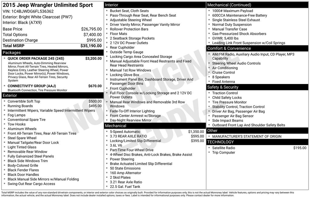 Bright White Clearcoat 2015 Jeep Wrangler Unlimited Sport 4WD 5-Speed Automatic 3.6L V6 24V VVTRecent Arrival!