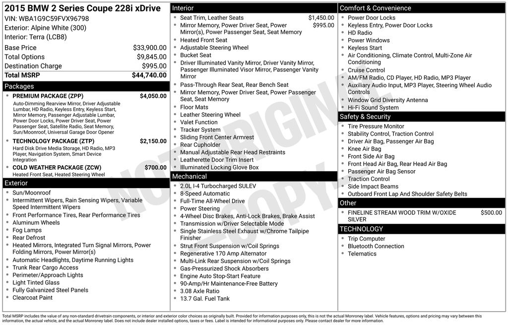 Alpine White 2015 BMW 2 Series 228i AWD 8-Speed Sport Automatic with Shift Paddles 2.0L I4 16V TwinPower Turbo23/35 City/Highway MPG